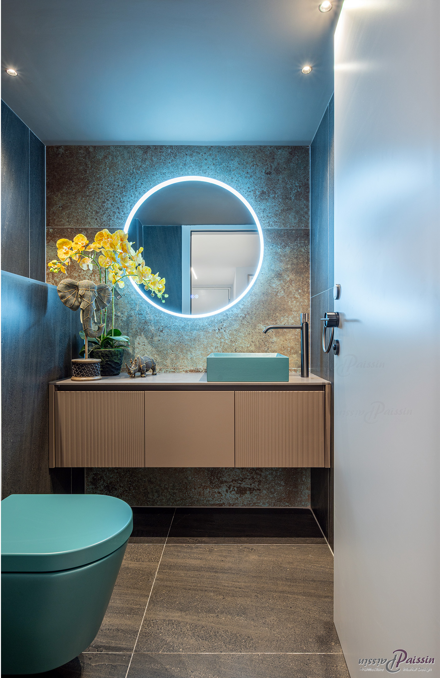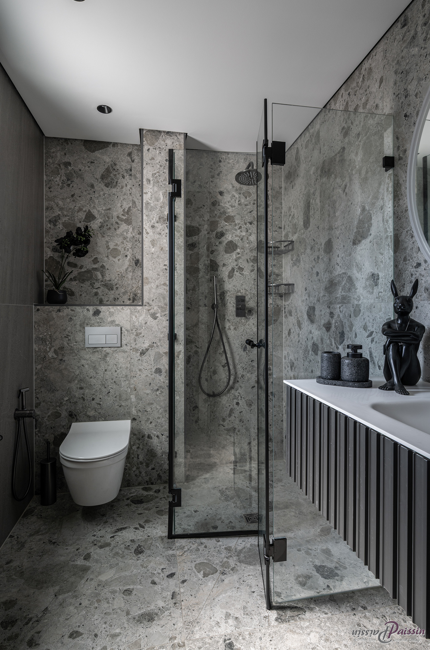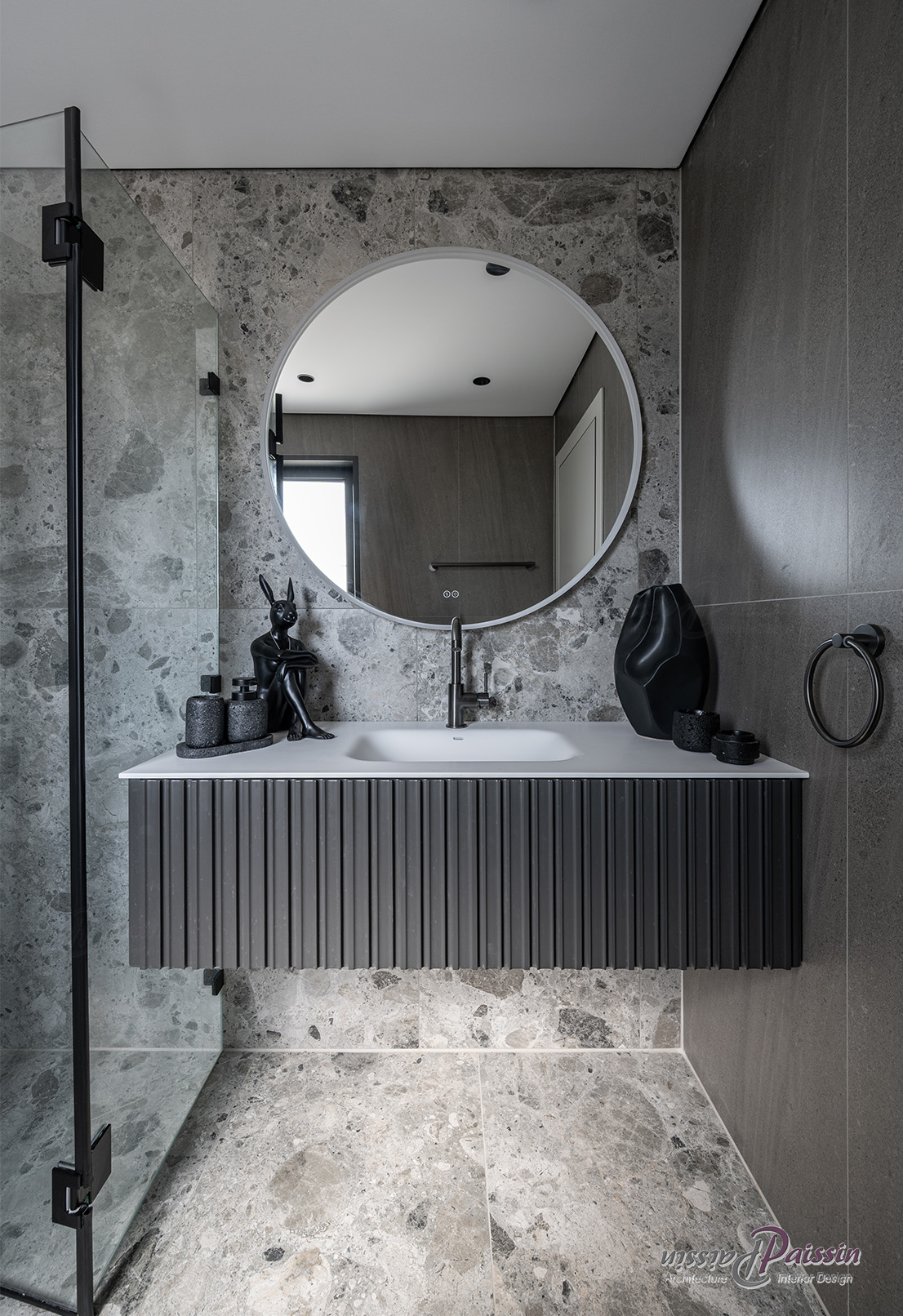 הבית משלב בין מטבח שחור דרמטי, שטיח צבעוני שמכניס חיים, וחדר שינה בגווני פודרה ורוד עתיק ומלטף. שילוב שמביא איתו הרמוניה של יוקרה וחום.